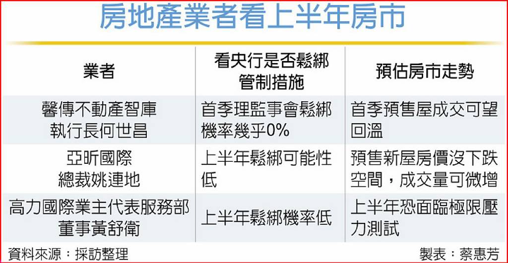 馨傳不動產智庫執行長何世昌指出,雖然2025年房市在政策管制下,成交量跌到低點,且不動產業期望央行可以「鬆一下」,但因房價修正幅度有限,市場資金依舊豐沛,預期央行會擔憂一旦鬆綁功虧一匱,因此機率渺茫。