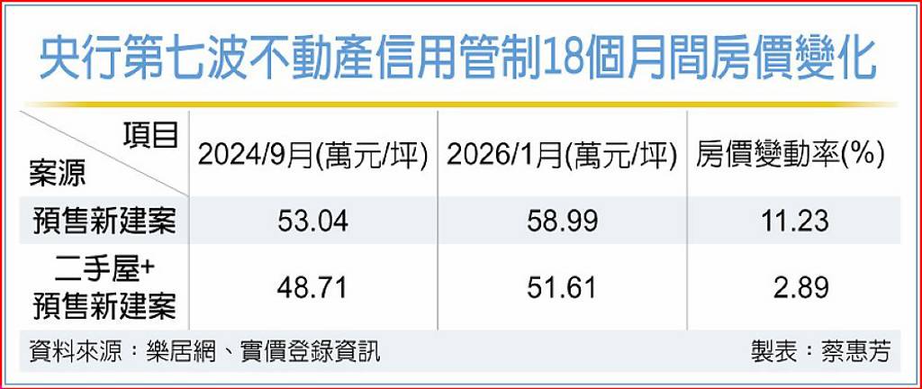 據樂居網統計,全台預售新建案房價面對第七波管制,每坪均價53.04萬元,至2026年1月微漲至58.99萬元,近一年半上漲11.23%。至於二手屋加新建案的平均房價,每坪從48.71萬元升至51.61萬元,微漲2.89%,房價未見有感下跌。